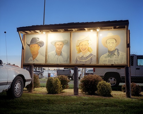 These portraits show the Roberts family—the father, E.C., and three of his five children: Gerald, Margie and Ken. All three children were world champion rodeo riders. The display is located just outside the rodeo grounds in Strong City, Kansas, where E.C. started his first rodeo in 1937. There's been a rodeo in Strong City ever since. Held in early June, when the bluestem grass on this part of the prairie is its greenest, the rodeo is Chase County's biggest event of the year. People come from as far as Abilene and Wichita. On Saturday morning a parade starts at Cottonwood Falls, the county seat, and travels one mile north on Highway 57 to Strong City, ending at the rodeo grounds. After the rodeo, there's a dance at Ken Roberts' old place east of town. Wooden tables and folding chairs brought up from the church circle the outdoor concrete dance floor. Beer and barbecue is for sale. The year I was there, proceeds went to re-roof the town's collapsing opera house. The dance lasts well past midnight. One couple told me that after the dance they always drive the thirty miles home on back roads with their headlights off, guided only by moonlight.