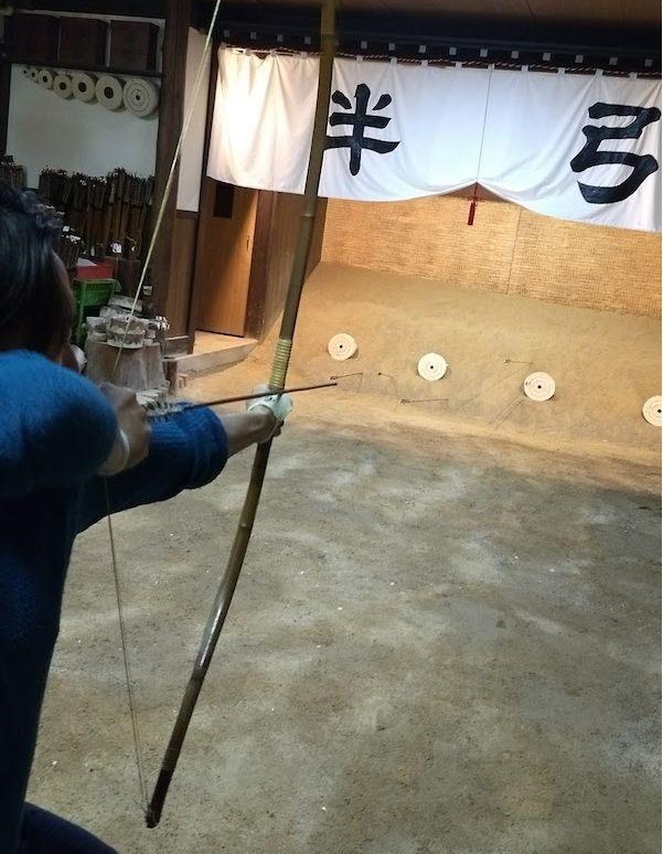 After dinner, we went downtown for a traditional Japanese archery (kyūdō) lesson. It was challenging. I hit the target once out of ten shots. The locals shooting with us showed us how it's done. They were impressive.