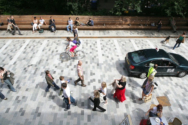 In addition to slowing down automobile traffic and making everyone more aware of each other, Shared Space also keeps traffic moving—slowly, but steadily—so it’s not the traffic jam inducing scheme one might imagine.