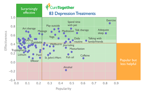 Treatments in the lower right quadrant are ones that lots of people have tried, but that have below-average effectiveness (e.g. caffeine, fish oil), and treatments in the lower left quadrant are reported as neither popular nor effective, so you may want to consider this when choosing a treatment (e.g. Effexor, Paxil).