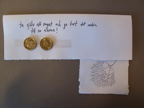Participants took seriously the invitation to get creative: One person drew pictures, attached them to coins (with instructions), and left them in public places; one participant engaged ‘virtually’ as a way of overcoming material barriers to her participation in public; another participated via post. Several handed out money on the streets to passersby (on trains, in town squares, and even at the top of a snow-covered mountain).