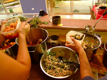 Mama Eloise, pregnant, sat rolling a thousand spring rolls (My family just ate them for our breakfast this morning. Delicious.) while Mama Amy sat chatting with her about children. Mama Amy had pre-prepared her dish of prawn jambalaya. This is a popular option with some women some of the time, to pre-prepare a dish the night before and bring it along. This gives you the golden pass straight to the chai and cake. Mama Kimberg had pre-prepared hers, also — a Thai chicken soup — and was sitting with the kids reading them stories.