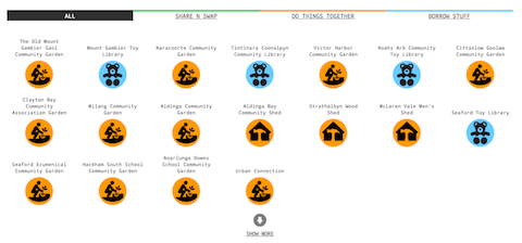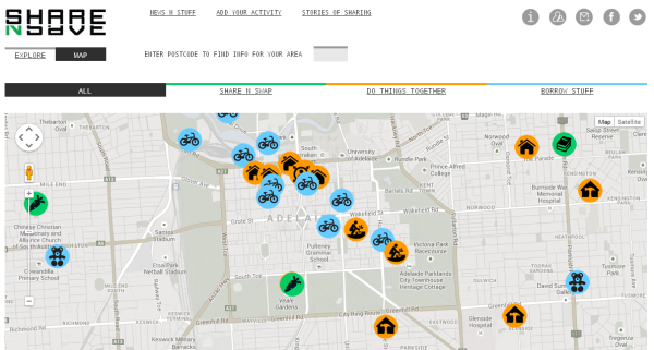 The Share N Save website is effectively a mapping website for collaborative consumption and sharing activities in South Australia. It’s the first of its kind in Australia and it helps South Australians discover local groups, events and activities to help with the cost of living, to connect with their local community and to avoid resources being wasted. The Share N Save website maps activities like toy libraries, community gardens, collective cooking groups and community produce swaps. It also takes in bike sharing, nappy libraries and things like Men’s Sheds.
