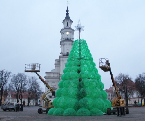 Via Christopher Jobson at Colossal, the city of Kaunas, Lithuania has commissioned artist Jolanta Šmidtienė to assemble an affordable holiday display. Using no city funds, Šmidtienė created a 13-meter tall Christmas tree out of recycled green bottles and zip ties. The results are stunning: