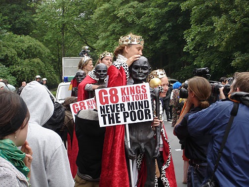 The art and creativity on display in Copenhagen continues a ten-year tradition at counter-globalization protests. Galschiot’s work here is based on similar art he displayed in Rostock, Germany in 2007 (above) where eight bronze emaciated "hunger marchers" were towed around by royal-robe-clad demonstrators under the title "G8 Kings On Tour–Never Mind the Poor." The Galschiot works, while stunning in their quality and humanity, are mostly rather somber reminders of the state of a large part of the world’s population.