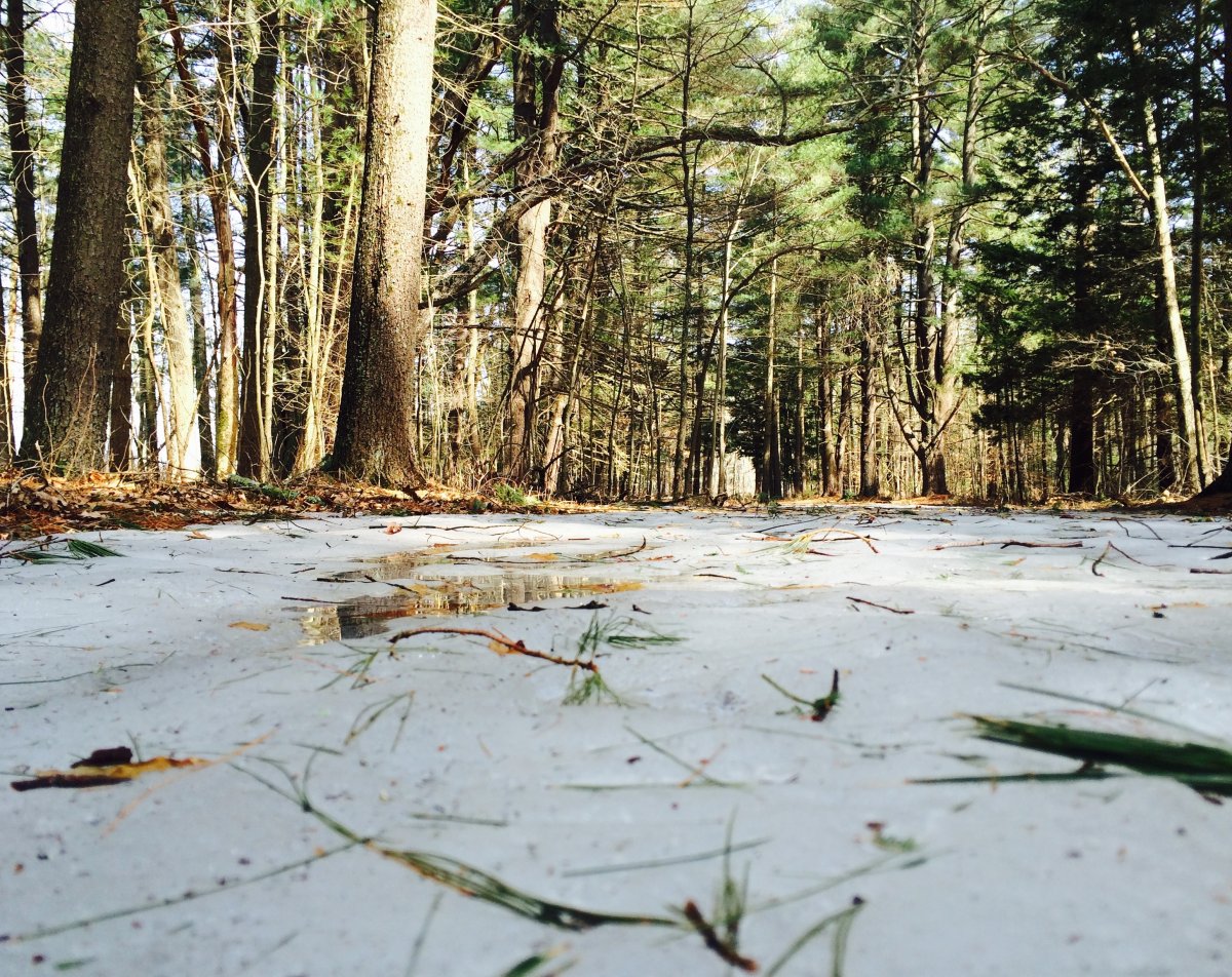 The shy torrents of spring: Late winter slowly thaws away on a track through the forest of the White Memorial Foundation near Torrington, Connecticut. Photo: Emma Weber.