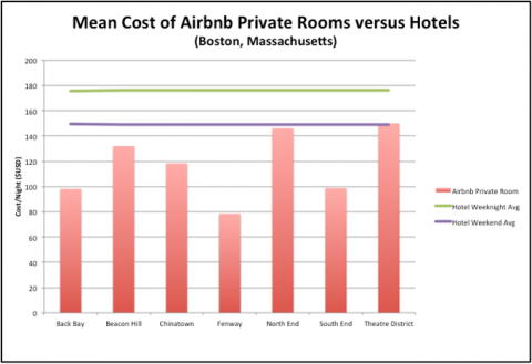 Airbnb rentals on average are much cheaper than staying in a hotel chain, but the cost can vary widely by neighborhood. I live in Back Bay where the average Airbnb listing cost per night is approximately $100 whereas my North End neighbors are closer to $140 per night. Compared to hotels, using peer-to-peer accommodations are still cheaper and in my neighborhood it could save travelers $49-$76 or more per night. These savings combined with the sense of community that Airbnb tries to build makes peer-to-peer housing an attractive option to a lot of people.