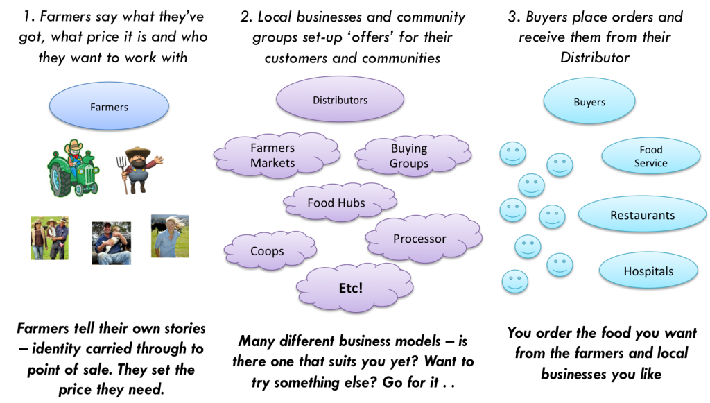 So we have a situation where there’s a whole lot of proprietary software options that solve parts of the problem and don’t talk to each other well. There’s also a lot of venture capital flowing into local food and a lot of commercial products being developed. Some groups were having conversations with the people running box schemes, co-ops and food hubs and effectively mining the knowledge that had been built up over 30 years, encoding that in software, privatising it and selling it back to the sector.