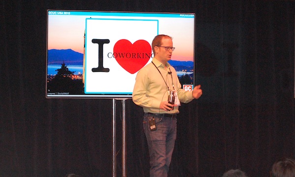 Brad Neuberg, who created the first coworking space, encouraged the GCUC audience to steal his idea and build on it. Photo: Cat Johnson