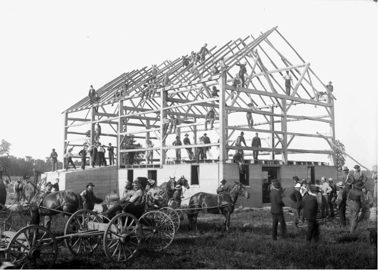 A good old-fashioned barn raising. Photo credit: Wikipedia.org. Used under Creative Commons license.