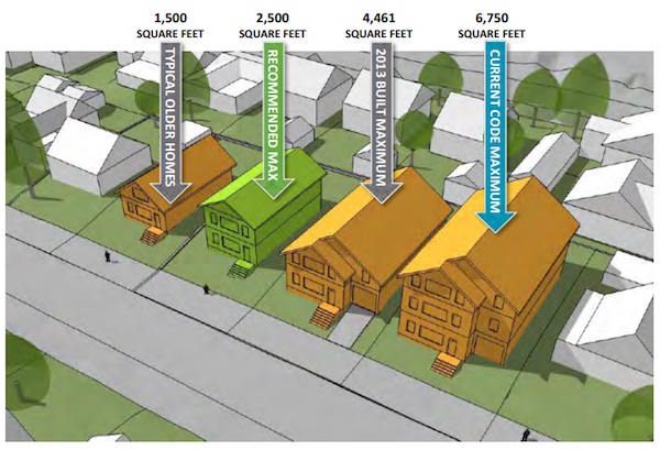 The city’s most recent proposal is to cap all new buildings on standard residential lots at 2,500 square feet total. This would prevent the largest 60 percent of new single-family homes—the McMansions, in other words—from ever being built.
