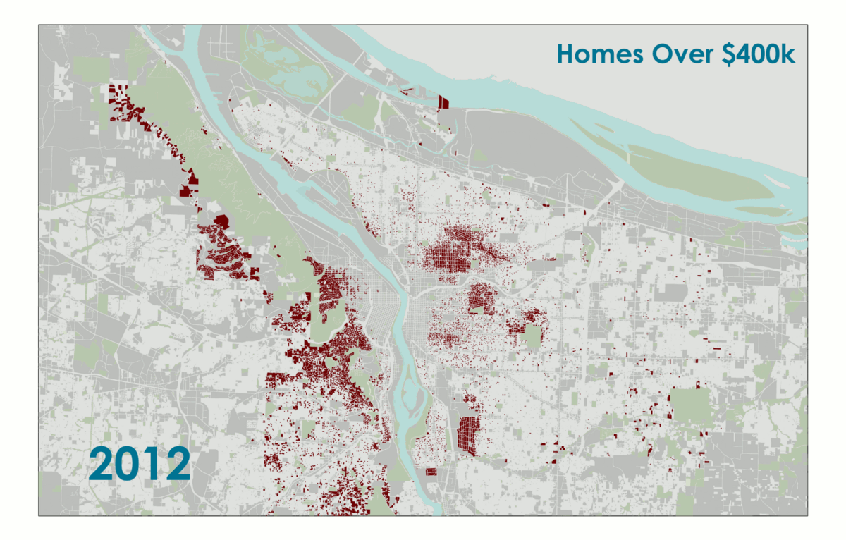 Property tax records show the alarming spread, over the last four years, of homes valued at $400,000 or more—enough to make them unaffordable to 59 percent of Portlanders, according to the latest Census estimates.