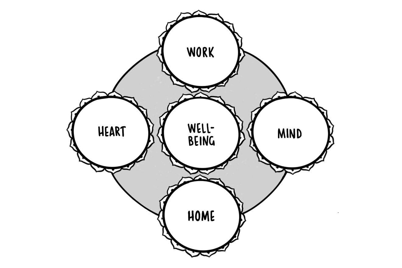 Another tool I’ve developed for preventing burnout is what I’ve come to call the Mandala of Life. It attempts to take the Mandala of the Five Buddha Families, which I described in chapter two as a pattern of Wholeness, and translate it into a guide for maintaining balance in everyday life. In this context, the Buddha Buddha family represents our physical and spiritual well-being, which needs to be firmly planted in the center. The Vajra Buddha family symbolizes our need to always be developing ourselves intellectually. The Ratna Buddha family is connected with home and community, the Padma Buddha family with love and self-expression, and the Karma Buddha family with service to our wider world.