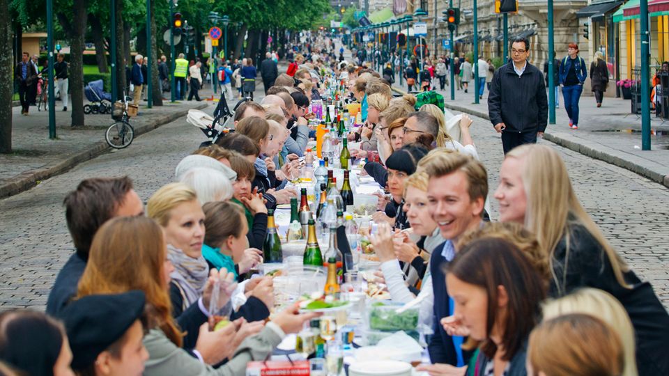 Dinner Under the Helsinki Sky transforms an urban thoroughfare into a community dining room. (Yle Uutiset)