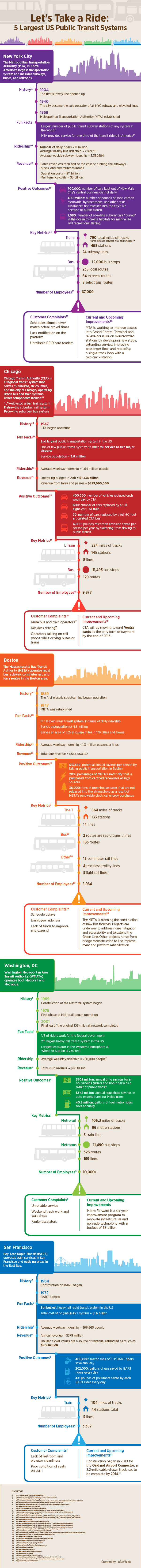 Few things are more shareable than the public transit systems. They carry millions of people to and fro in big cities, and they've done so in the U.S. since the first electric street car began operations in Boston circa 1889. In the 125 years since, public transit has come a long way. A new infographic from the University of North Carolina breaks down the statistics for the five largest U.S. systems — Boston, New York, Chicago, San Francisco, and Washington, DC. While this is delightful stuff for transit nerds, it's also a potent reminder to everyone how valuable public transit is to well-functioning cities.