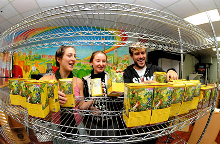 Alex Stone, Christina Oatfield, and Shaun Mullen arrange their first Food Collective delivery — boxes of Yerba Mate — on newly assembled shelves. Photo credit: Peg Skorpinski. Used under Creative Commons license.