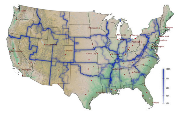 Theoretical physicist Dirk Brockmann used the dollar bill tracking site Where’s George to see how money moves, and create new state boundaries based on our economies. The darker the blue lines, the less likely it is a dollar bill will have crossed it.