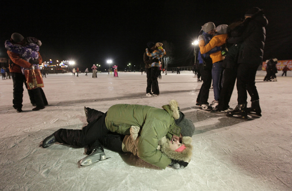 Couples compete during the "Kiss on the Ice" contest to share the longest kiss in Russia's Siberian city of Krasnoyarsk on February 13. Photo Credit: Ilya Naymushin/Reuters.
