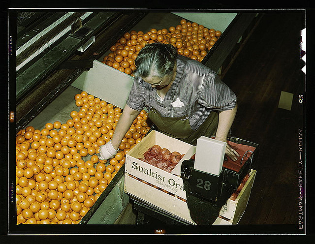 Packing oranges at a co-op orange packing plant, Redlands, California. Photo credit: The Library of Congress via Foter.com / No known copyright restrictions.
