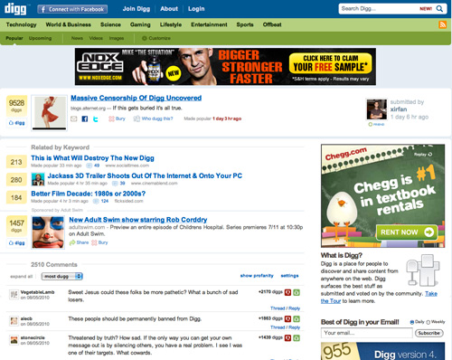 The venerable social news service Digg has a problem. As Alternet reports, a team of conservative users have been gaming the system for years through an organized effort to vote down news items contradictory to their ideology. Recently, Jezebel.com looked into the outward hostility to women from members of the boys-club userbase, which posts headlines and comments filled with frat-house misogyny. On a network that has long claimed to democratize the news, it’s looking like a selective group is calling the shots. And that’s a problem.