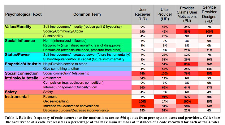 The first of its kind to capture the P2P service provider's point of view, the study was grounded in 68 "semi-structured" interviews with users and providers representing 43 different services, including both for-profit and non-profit organizations. The user group of 45 individuals included those at both ends of the exchange (accommodation-rental hosts, for instance, as well as renters). The researchers pulled relevant quotes from the transcribed interviews, then coded them according to the source's role in the P2P system and the "psychological root" of the motivation expressed. These psychological categories (of which more than one could be assigned to each quote) included value/morality, social influence, status/power, empathetic/altruistic, social connection, intrinsic/autotelic, safety, and instrumental.