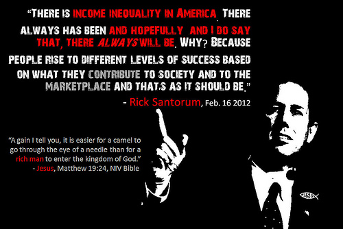 Former Republican presidential candidate Rick Santorum's take on income inequality as contrasted with a Biblical verse. Photo credit: Cory Grenier. Used under Creative Commons license.