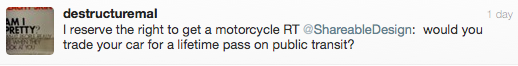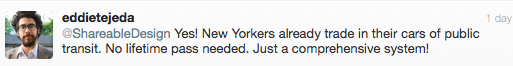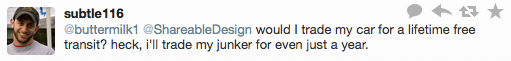 Earlier in the week, Beth Buczynski wrote about a campaign in the city of Murcia, Spain which offers residents lifetime public transit passes if they give up their cars. On Twitter, Facebook and the original post, we asked the Shareable community if they would do the same given the opportunity. Some of the responses: