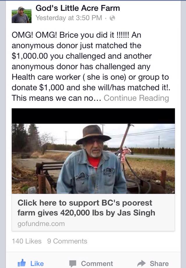 Another friend introduced me to a farmer who has been giving me vegetables. He never asked for anything in return. Now he needs help to get a tractor, so I decided to pay it forward, he was in the news recently and we all raised $12k in one day for him. Later, he surprised me and got me in tears and decided to start a "Brice Royer cancer survivor" garden and will deliver food to cancer patients. It will help many of my friends who are in need. He can deliver pesticide free food to 25 people for the season for only $1000. That's $13.33 for weekly food delivery one person for the whole month, which is incredible. We are aiming to expand the free farm internationally. I'm still recovering but I wanted to share this in the hopes that it will inspire you. If anyone would like to get in touch, feel free to follow me on Facebook where I post my latest public updates on my recovery.